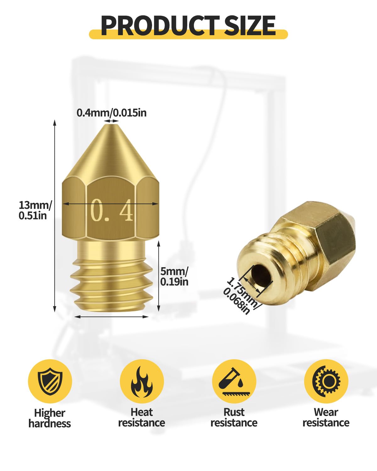 Durable 3D Printer Nozzle: Made of high-quality brass, this 3D printer nozzle is strong, sturdy, and resistant to heat and wear. Ideal for high-temperature printing, it ensures reliable performance for your 3D printer nozzle and offers easy installation and replacement