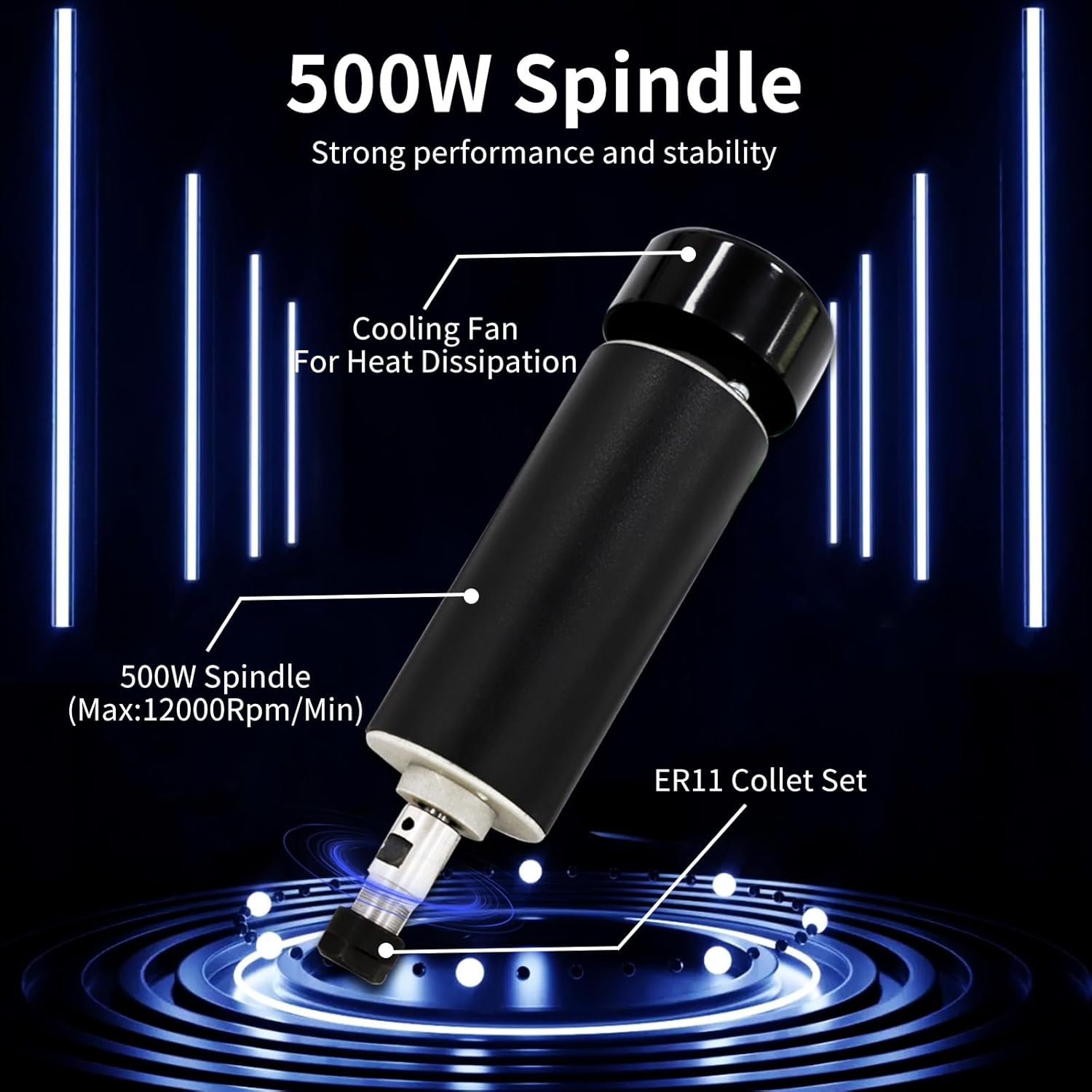Upgrated 500W Spindle: Upgrated 500W spindle enables your machine to excel in the most challenging applications, while maintaining precision and operational efficiency. 500W high-speed motor with 0-12000RPM range for efficient and precise cutting.