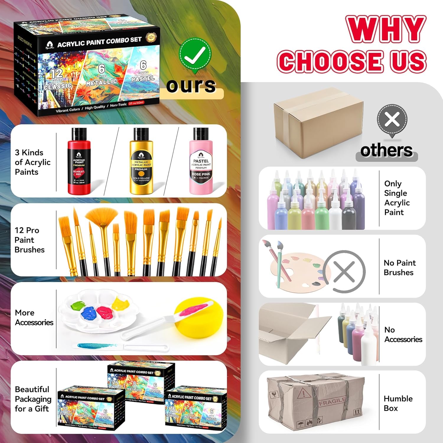 40 Pcs Classic & Metallic & Pastel Acrylic Paint Set with 12 Brushes, 2 Knives & Palette, 24 Colors (2oz/60ml) – for Adults, Kids, Artists & Beginners – Arts and Crafts Painting Kit