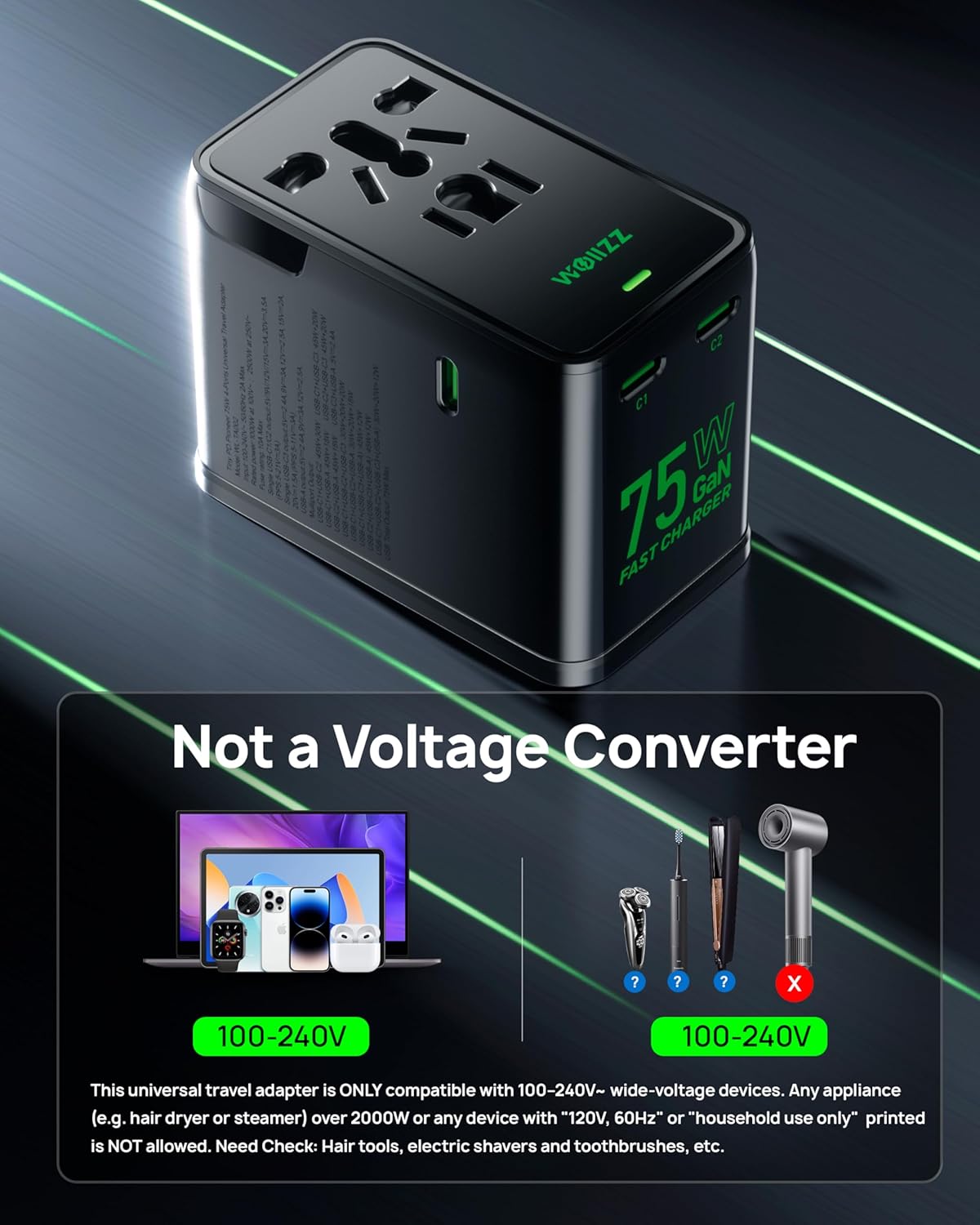 ADVANCED GaN FAST CHARGING: This universal travel adapter runs cooler with GaN, packing 75W total into a compact body. Two USB-C laptop ports hit 70W each for rapid MacBook top-ups, plus USB-C 30W and USB-A 30W for fast phones, tablets, cameras, and earbuds charging. With multiple devices, power is smartly shared (75W total).