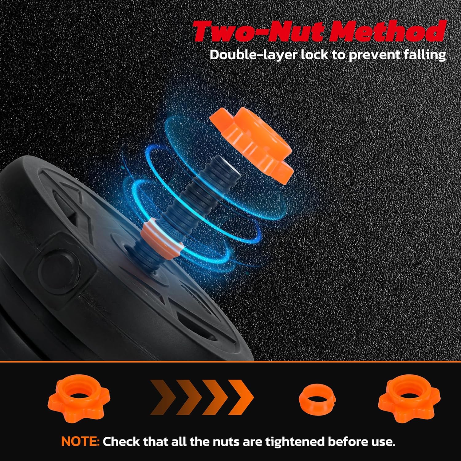 Secure Double Locking Design: The dumbbell set’s handle features a dual-nut fastening system that ensures weight plates stay firmly in place while you exercise. The threaded bar of this adjustable dumbbell set combined with an additional tightening ring minimizes shifting, keeping the setup stable during higher-rep or more dynamic movements. This weights dumbbells set’s structure designed to provide stable and secure training