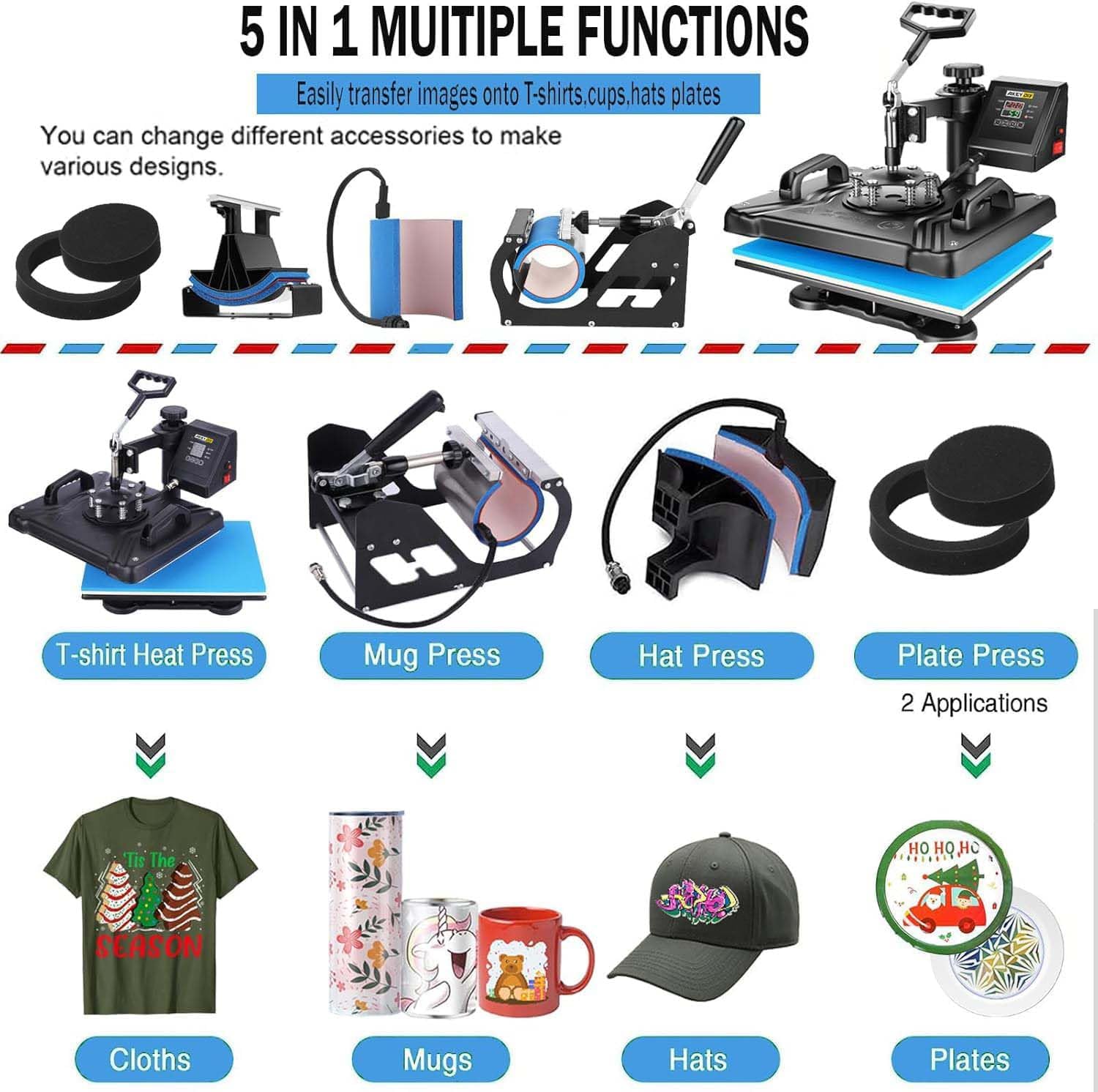 AKEYDIY Upgraded 5 in 1 heat press machine for t shirts Mug Hat Plate Cap 360-Degree Swing Away Multifunctional Combo