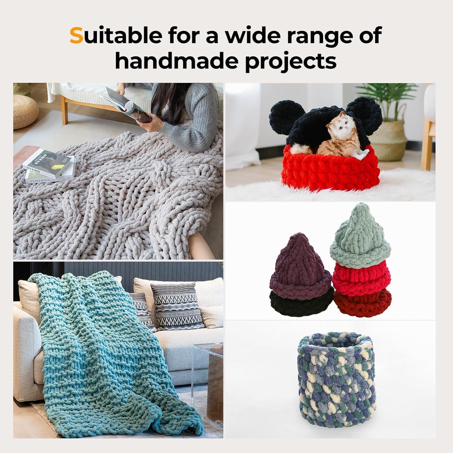 【Versatile & Endless DIY Possibilities】Our thick bulky yarn is perfect for a variety of DIY projects, including hand-knit blankets, home décor, hats, scarves, cushions, pet beds, and more. It supports different knitting techniques (crochet, knitting, or hand weaving) and is ideal for crafters of all skill levels. Whether you’re a beginner or an experienced artisan, you’ll love the creative freedom this yarn provides.