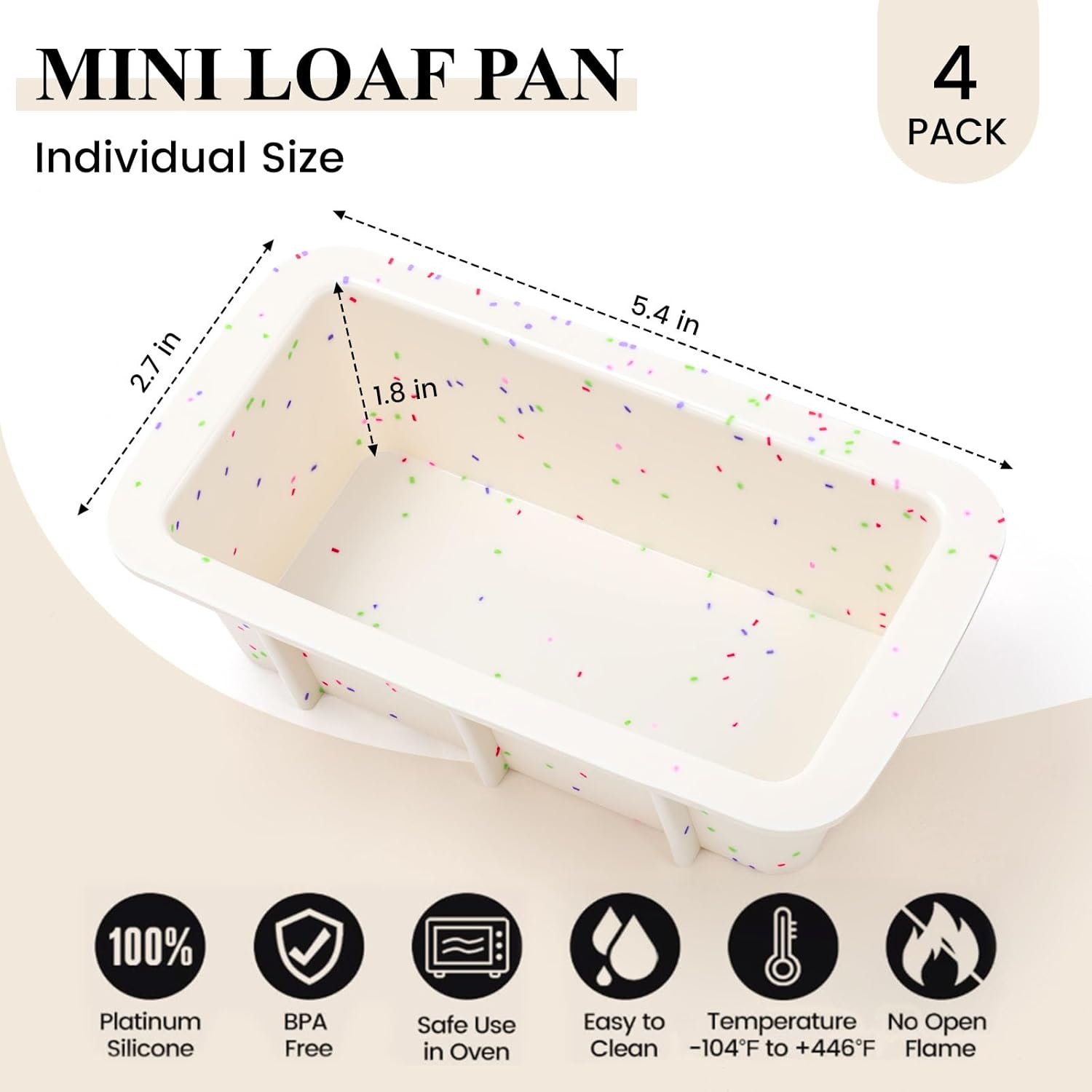 Set of 4 Silicone Mini Loaf Pans: Our product includes 4 pcs silicone small loaf pans, Each bread pan size: 2.7×5.4 inch, perfect for making mini breads, cakes and meatloaf to share with your friends and family