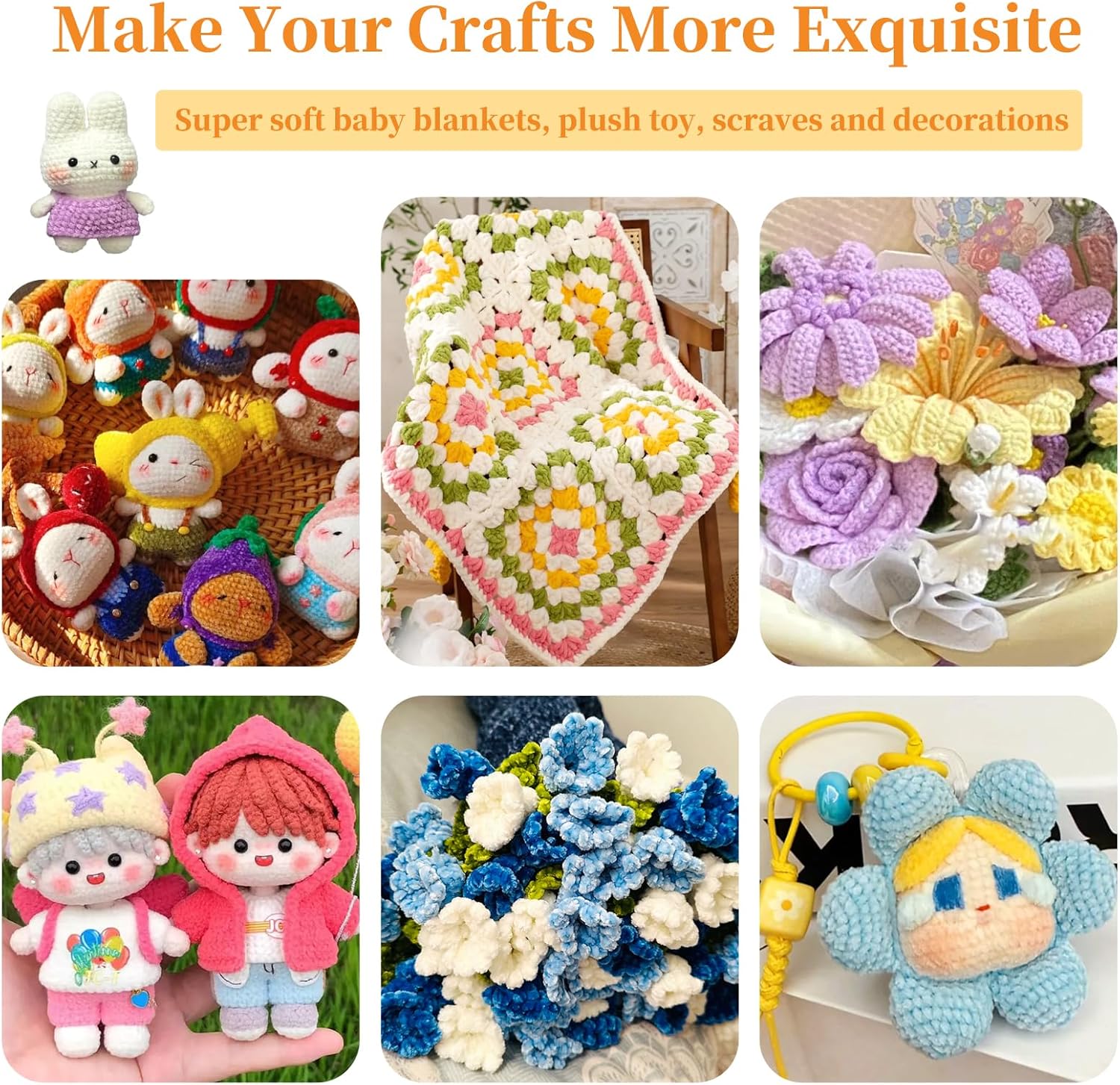 2. Ultra Soft & Baby Friendly: Made of 99.99% polyester fiber, our soft yarn features a fluffy and smooth texture that is skin-friendly. It is not easy to knot, shed, come apart, which keeps your handmade items delicate and intact. It is gentle on baby skin, making it an ideal baby chenille yarn and soft yarn for baby blankets or dolls’ clothing