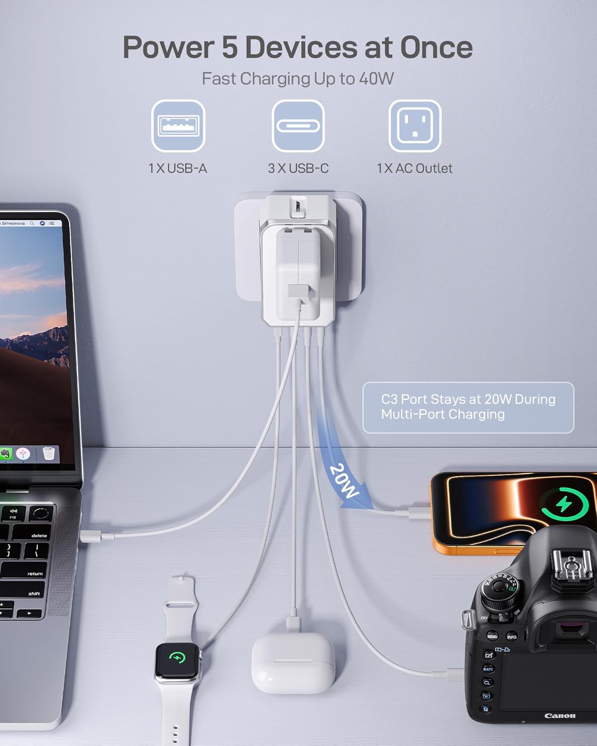 40W PD Fast Charging: The USB-C3 port delivers up to 40W PD fast charging, powerful enough to fast-charge smartphones, tablets, and other USB-C devices. During multi-port charging, the C3 port maintains 20W PD to keep your primary device powering up quickly.