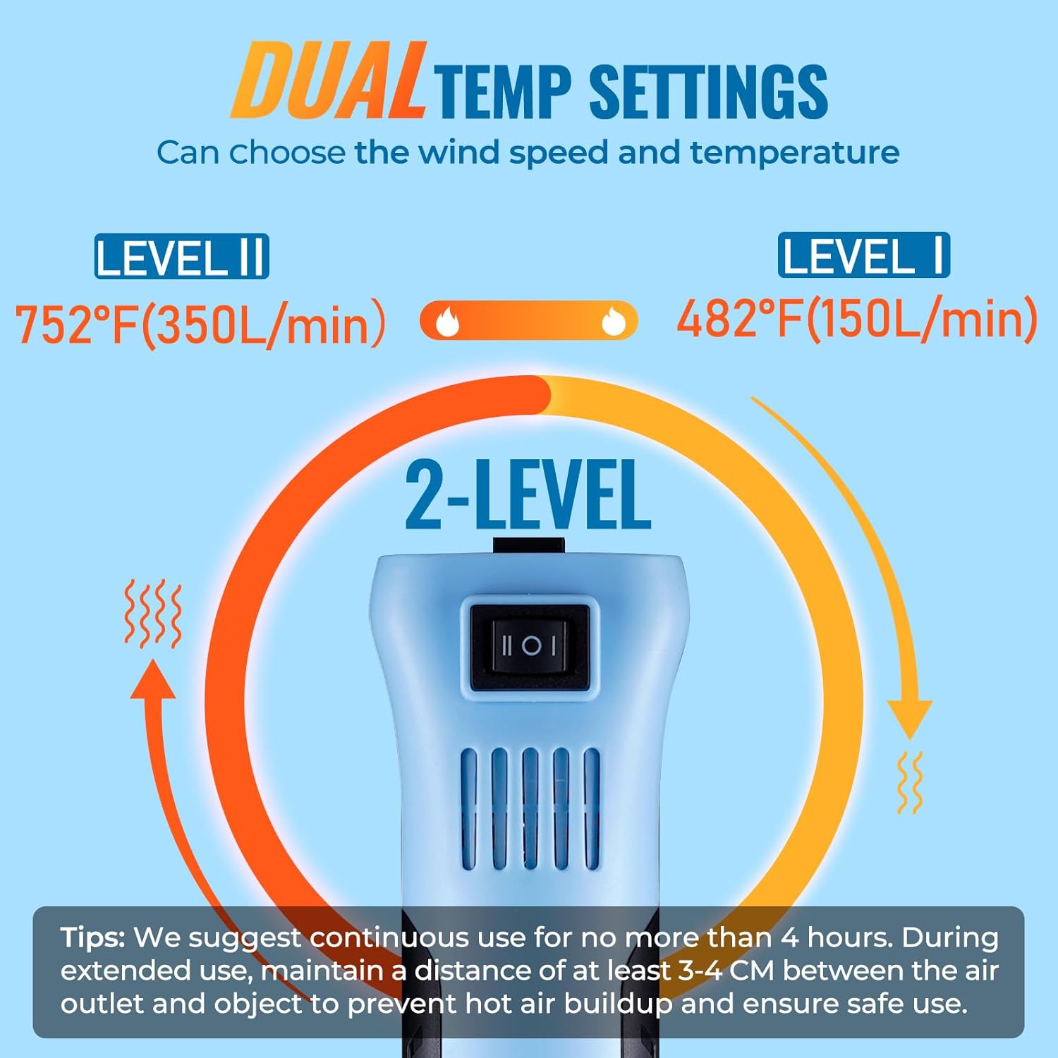 Fast Heating Dual Temp Control: LET’S RESIN heat gun is equipped with a high power of 350W and 2 temp adjustment settings. The I-level is 482 ° F/250 ° C with a wind speed of 150L/min, and the II-level is 752 ° F/400 ° C with a wind speed of 350L/min. Reach your desired working temperature with our heat gun for crafts within seconds and work efficiently.