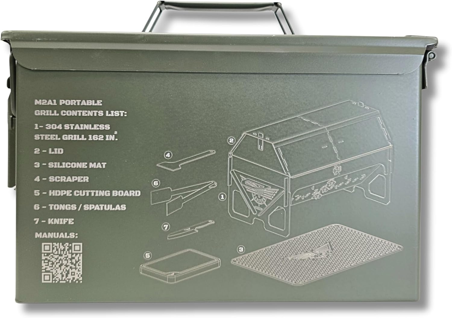 The grill, lid, tools, and board fit neatly inside an authentic M2A1 ammo can, making transport simple, secure, and ready for the next adventure.