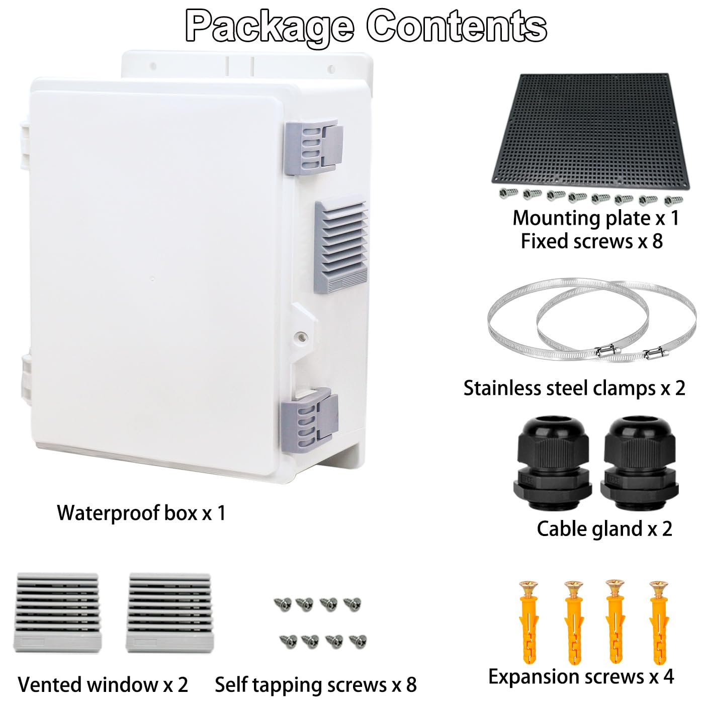 【Abundant Accessories】 Features an internal mounting panel for easy installation of electrical components, 2 cable glands for easy access of wire connection,2 stainless steel hoops and 4 sets of metal fixing screws for installing on wall or other fence.