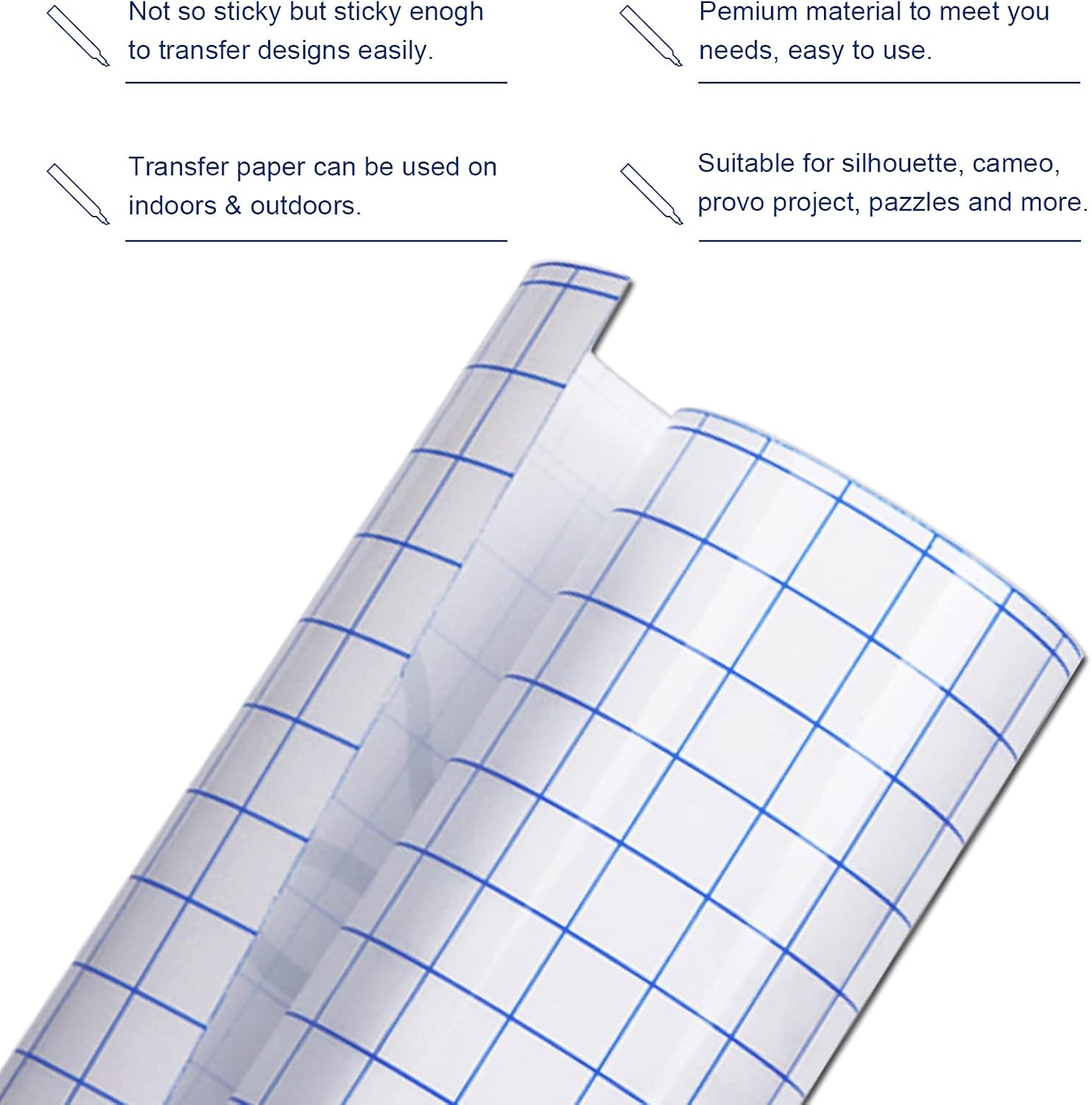 Not suitable for transferring it to paper or fabric.Not suitable for high temperature or extremely cold surfaces.Not suitable for thermal transfer vinyl, flash vinyl, holographic vinyl.The transfer tape has clear blue alignment grid on transparent side.