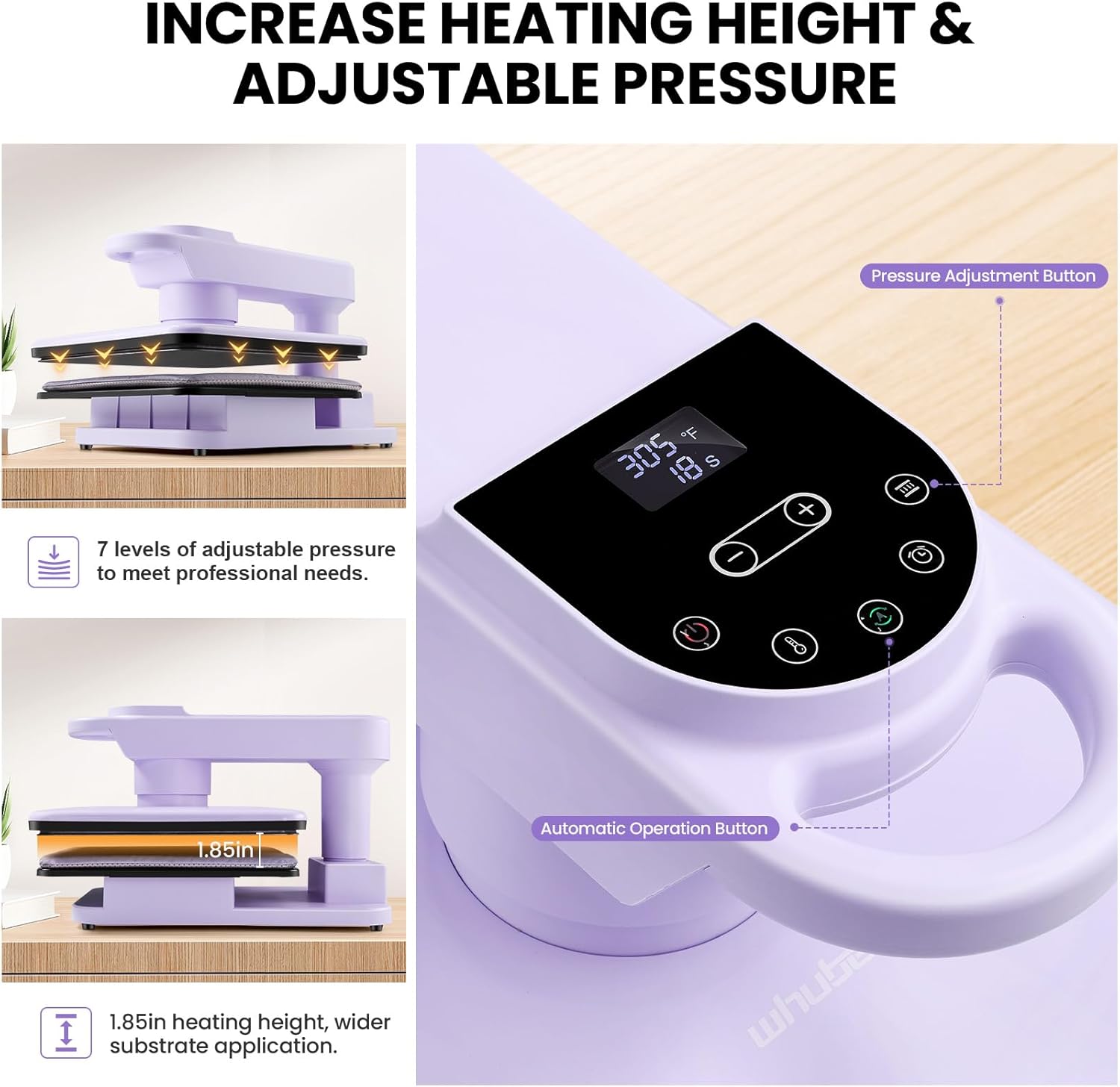 ✅ 1.85IN Heating Height & 7 Leves Pressure Adjustable: The Whubefy heat press machine for tshirts now features an increased height capacity of 1.85 inches, allowing for greater versatility with a wider range of projects, including bulkier items beyond standard t-shirts. It offers 7 adjustable pressure settings, with the pressure level displayed on the screen, ensuring optimal results for various materials and applications, including DTF projects.