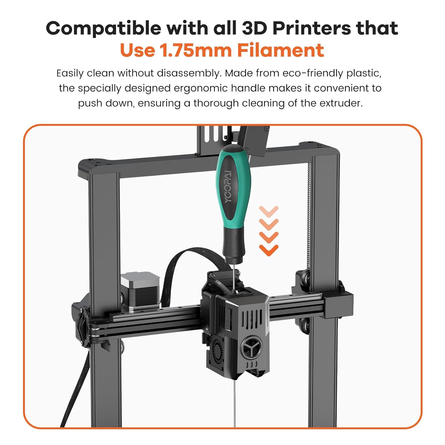 【Easy to Use】: The handle is made of soft rubber material, designed ergonomically and fully compatible with the grip method, making it easier to use; The design of the arrow tip blocking the puncture matches the shape of the nozzle end, with a length of 150mm and a diameter of 1.5mm, suitable for 1.75mm 3D printing nozzles; Clean without disassembling the nozzle!