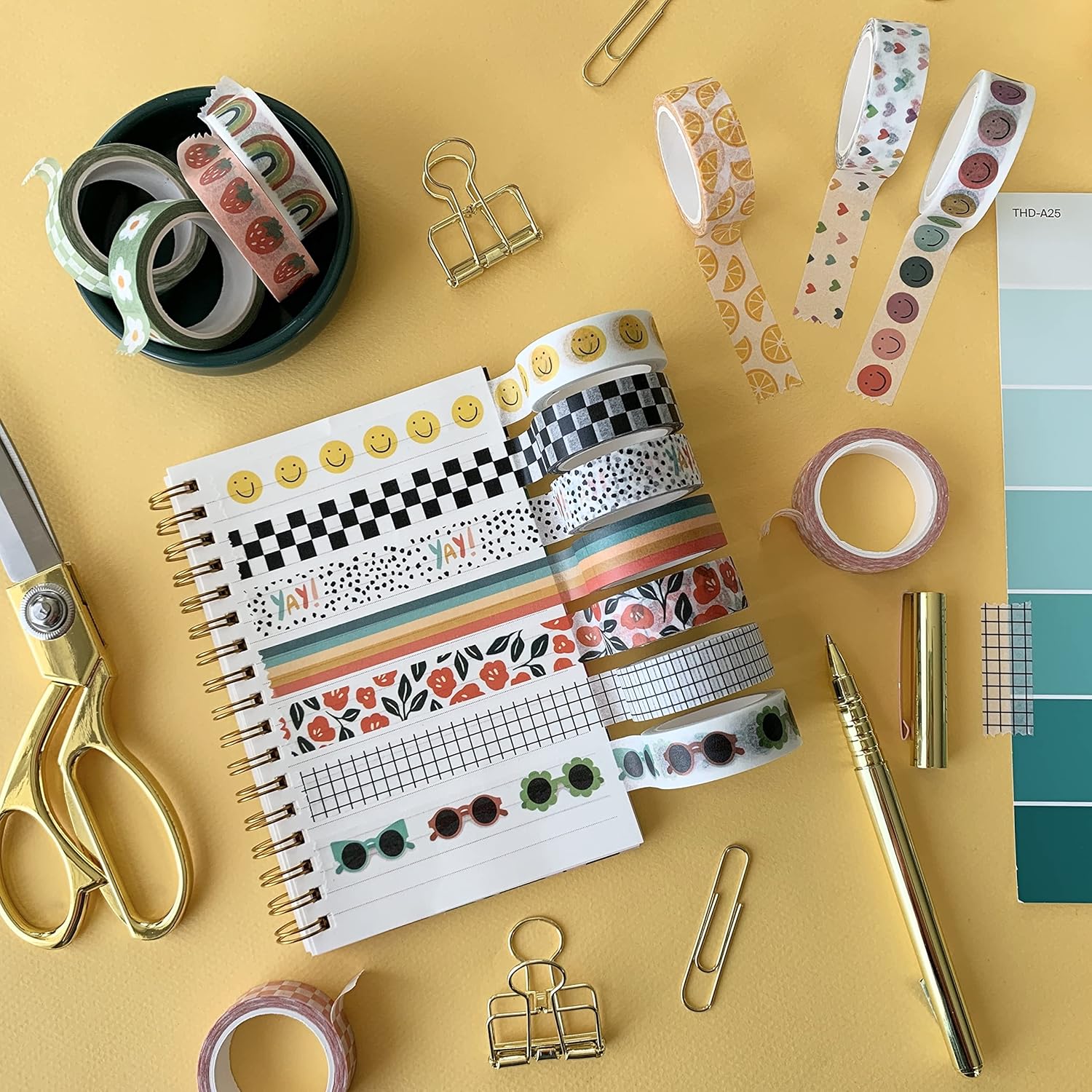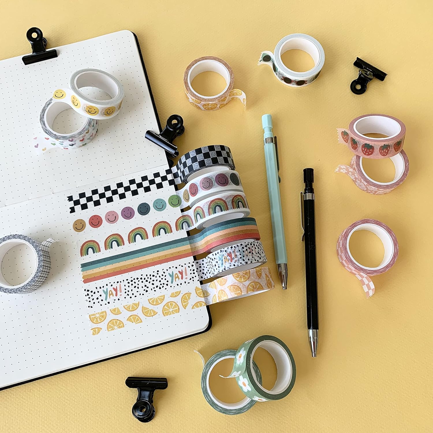 GET CREATIVE: Spark your creativity with an adorable new washi tape set! Designed with our original, hand-drawn artwork, these tapes will have you coming back again and again with new ideas for how to use them in your favorite projects. The sixteen designs include floral, rainbow, smile face, checkerboard, strawberries, grid, stripe and more, matching a variety of different styles like vintage washi tape, kawaii washi tape, retro, and botanical. Embellish thank you cards, school supplies, stationary, bible journaling, create fashion illustrations, or add a finishing touch to gift wrap.